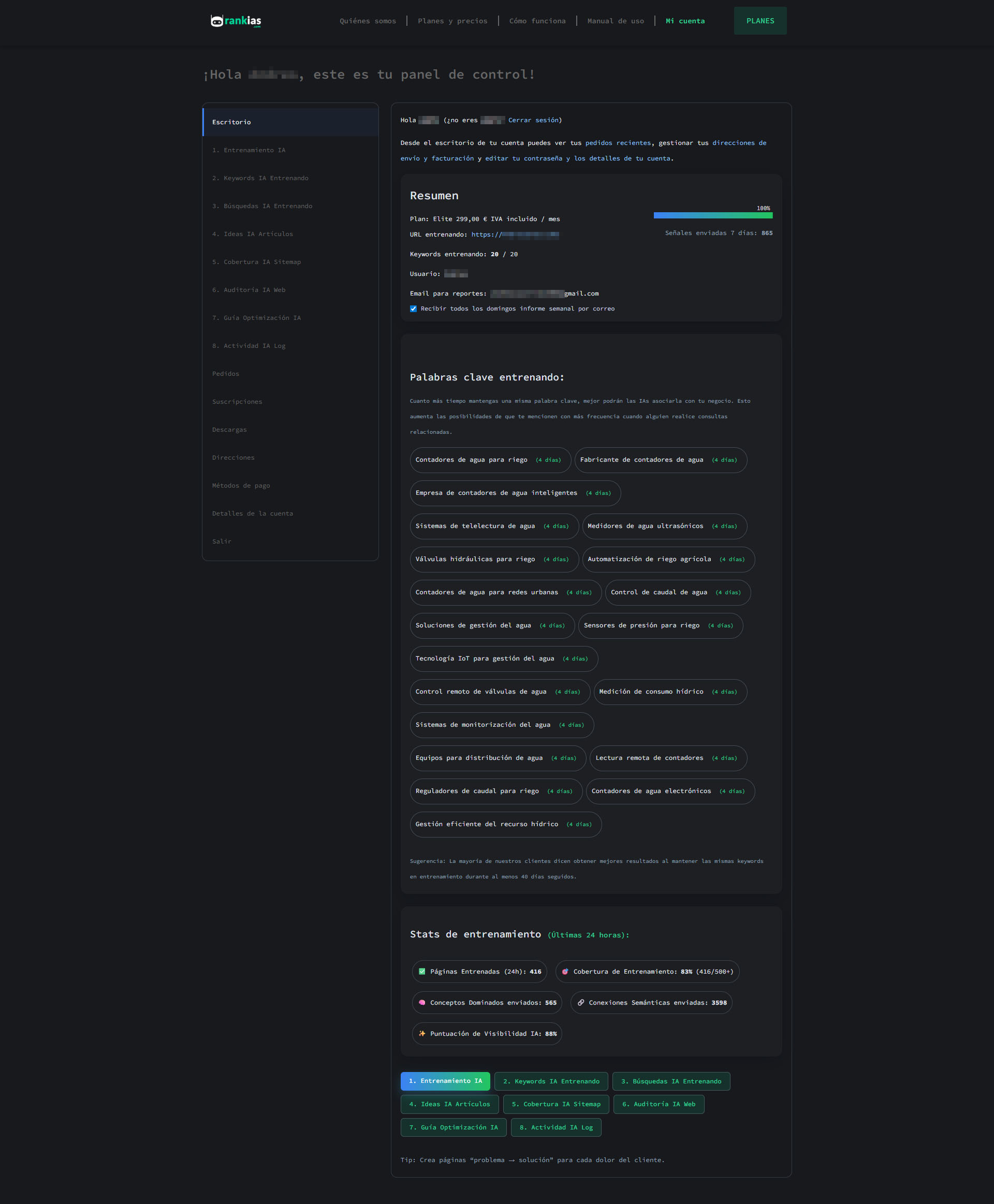 Resumen de como nuestra plataforma entrena a las IAS. Aquí puedes ver el resumen de tu cuenta, notificaciones por email, palabras clave entrenando, stats de entrenamiento de las últimas 24 horas y más.
