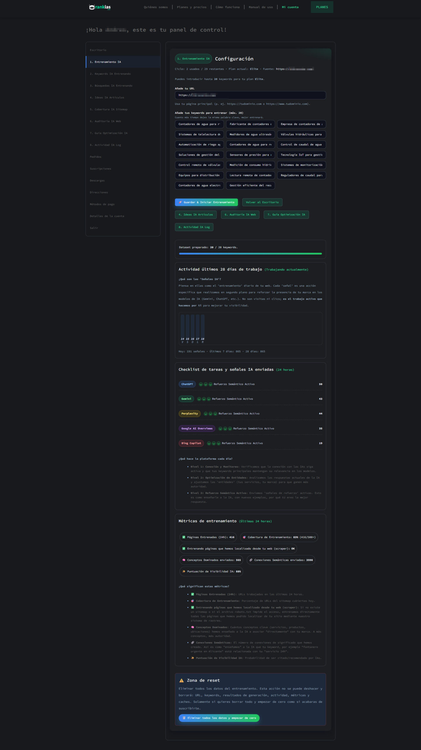 El núcleo del sistema. Aquí configuras tu URL y las keywords a entrenar. Desde aquí controlas el trabajo diario, las tareas y las métricas de entrenamiento.
