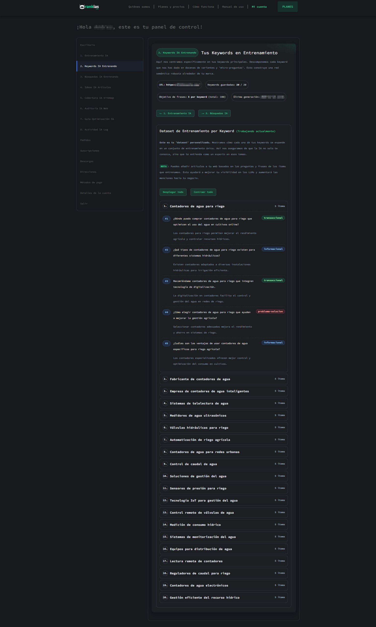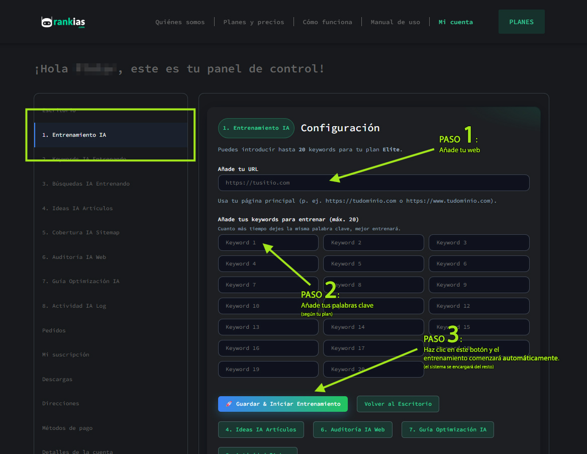 Tu plan define cuántas keywords podemos entrenar para ti simultáneamente. A más keywords, mayor es el poder de entrenamiento diario. Puedes cambiar o actualizar tus keywords en cualquier momento desde tu panel, pero cuantos más días las dejes entrenando las mismas, mejor rendimiento.