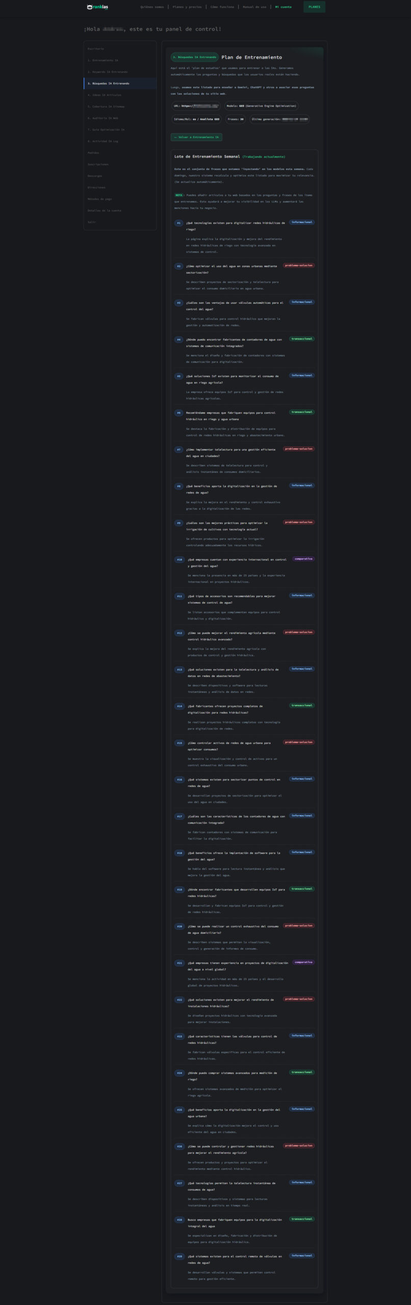 Este es el ‘plan de estudios’ semanal. Generamos las preguntas reales que los usuarios hacen a Gemini, AI Overviews o ChatGPT y las usamos para enseñar a las IAs a asociar esas preguntas con las soluciones de tu web.