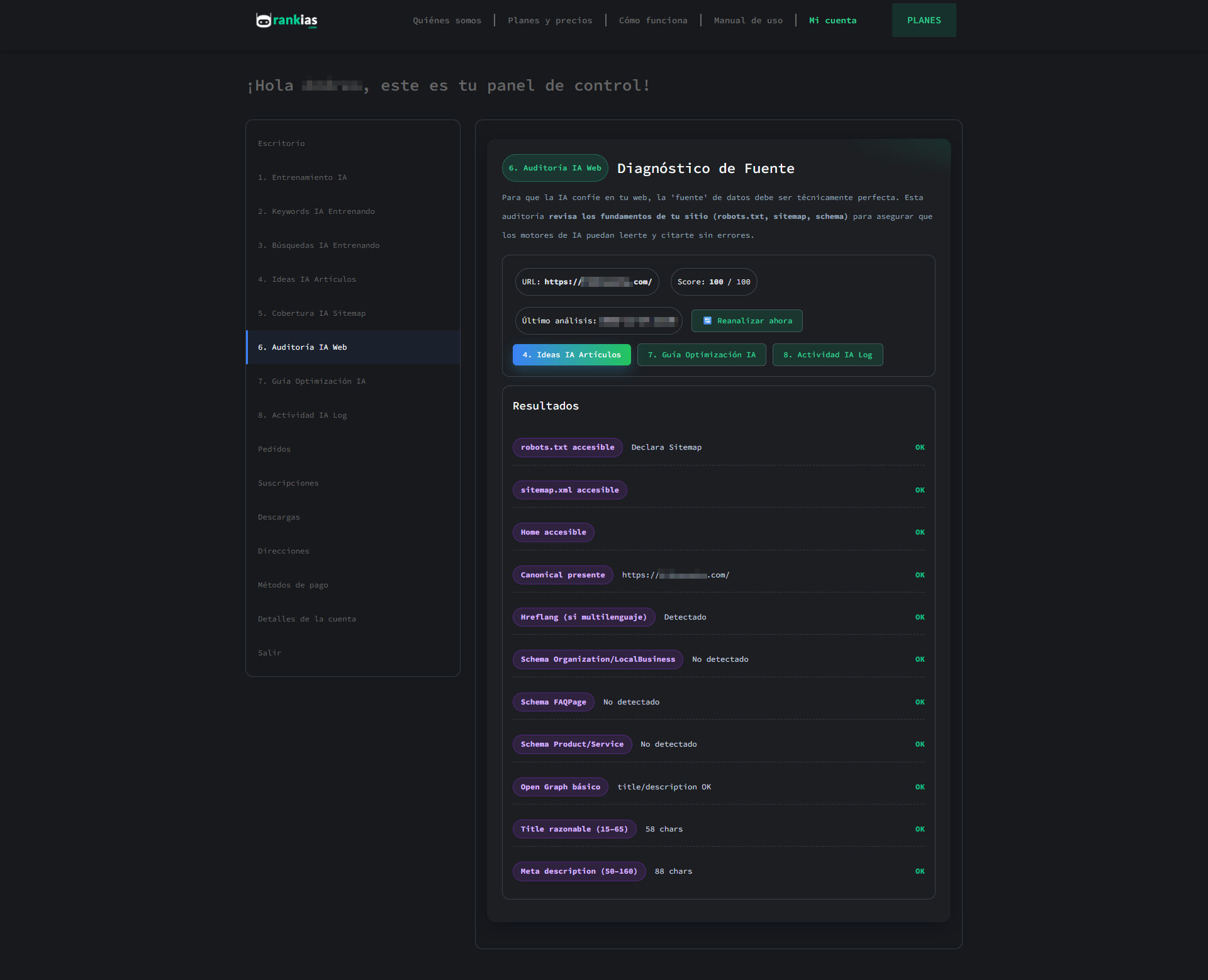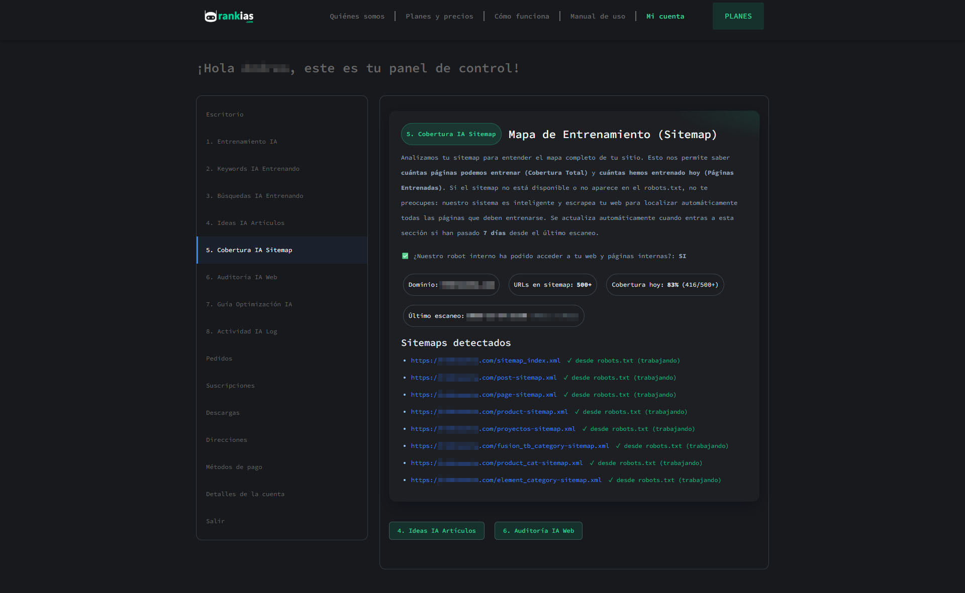 Analizamos tu sitemap para entender el ‘mapa’ de tu sitio. Esto nos permite saber cuántas páginas tenemos que entrenar (Cobertura Total) y cuántas hemos entrenado hoy (Páginas Entrenadas).